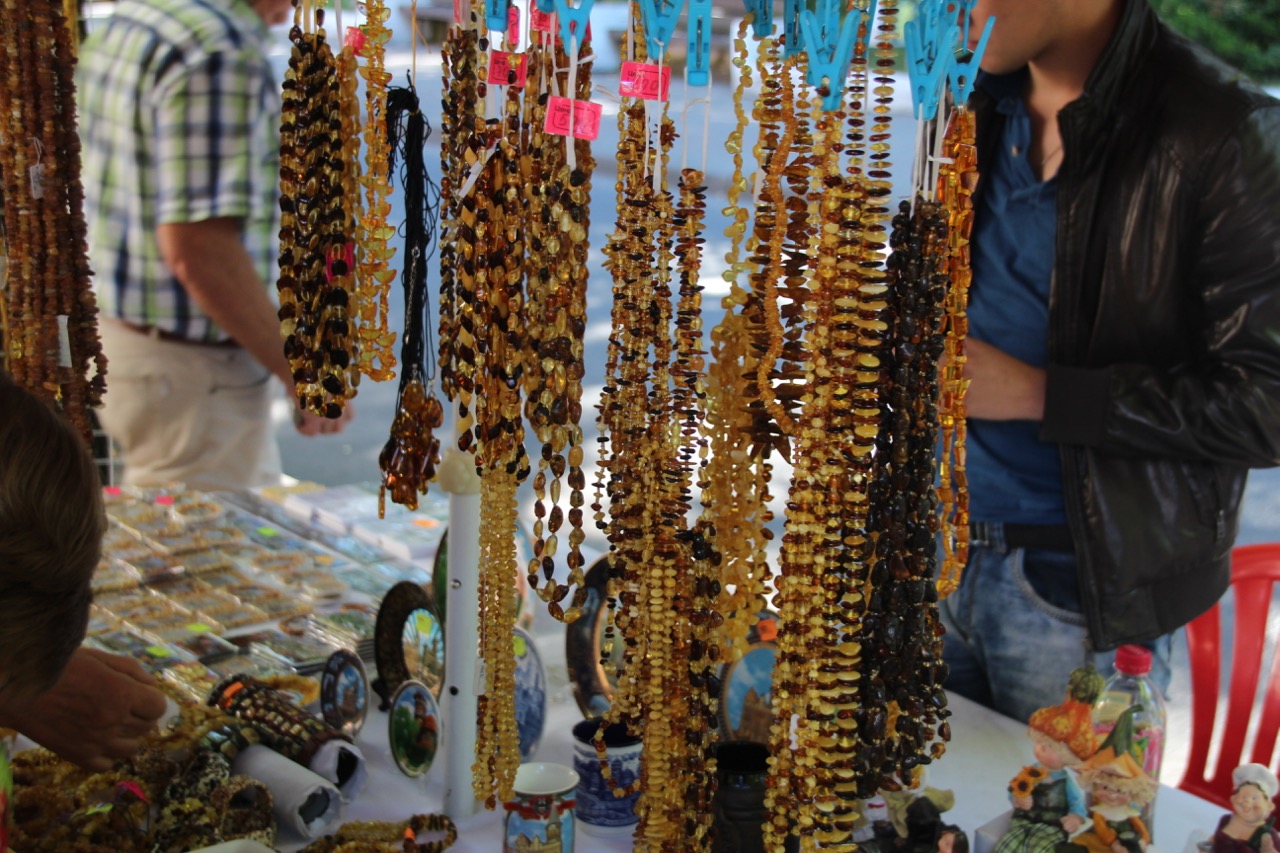 Wir fahren wieder zurück in Richtung Königsberg, und dann weiter in Richtung Nordwesten bis Rauschen. Der Badeort hat etwa 10.000 Einwohner und liegt an der samländischen Ostseeküste. Als wir dort ankommen, sehe ich das typische Flair, das wohl jeder Badeort an der Nord- und Ostseeküste hat. Viele Buden, die vor allem Bernstein in allen Variationen anbieten, sowie Badekleidung, Essen und Trinken und was das Herz der Badegäste sonst noch begehrt. Da Rauschen im 2. Weltkrieg nicht zerstört wurde, ist viel von der alten Bausubstanz erhalten und sogar bis auf wenige Ausnahmen in gutem Zustand. Man merkt, dass die Stadt heute ein beliebtes Ausflugsziel der etwas betuchteren Bevölkerung von Königsberg ist und auch aus dem ganzen Rest der Russischen Föderation im Sommer Gäste kommen. Viele der Gebäude sind noch im Besitz des Militärs, da Rauschen nach dem Krieg vor allem der Erholung und Genesung von Soldaten und Offizieren diente. Der Strand hier ist nur bedingt zum Baden geeignet, da die Küste sehr felsig ist und der früher vorhandene Sandstrand bis auf wenige Reste inzwischen von der Ostsee abgetragen wurde. Dafür gibt es eine schöne Uferpromenade auf der sich noch dutzende von weiteren Verkaufsständen aneinanderreihen.