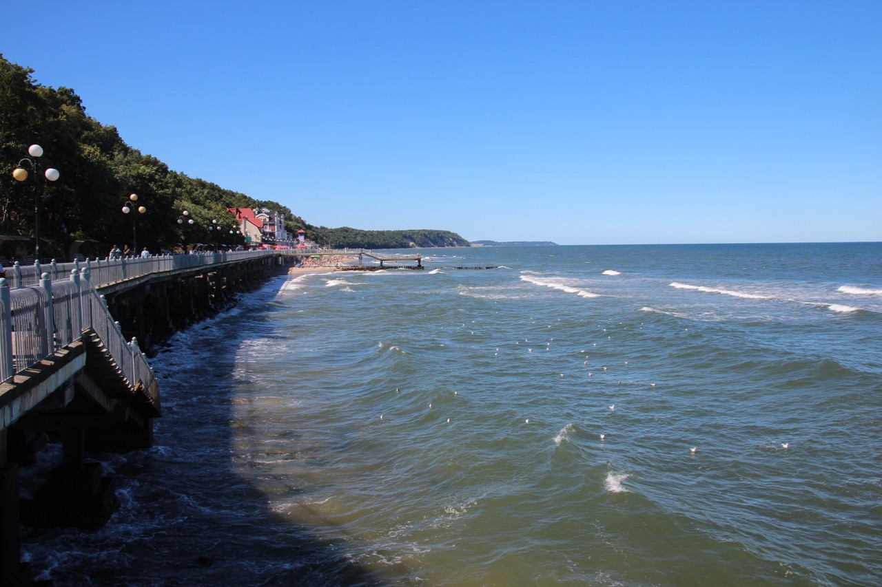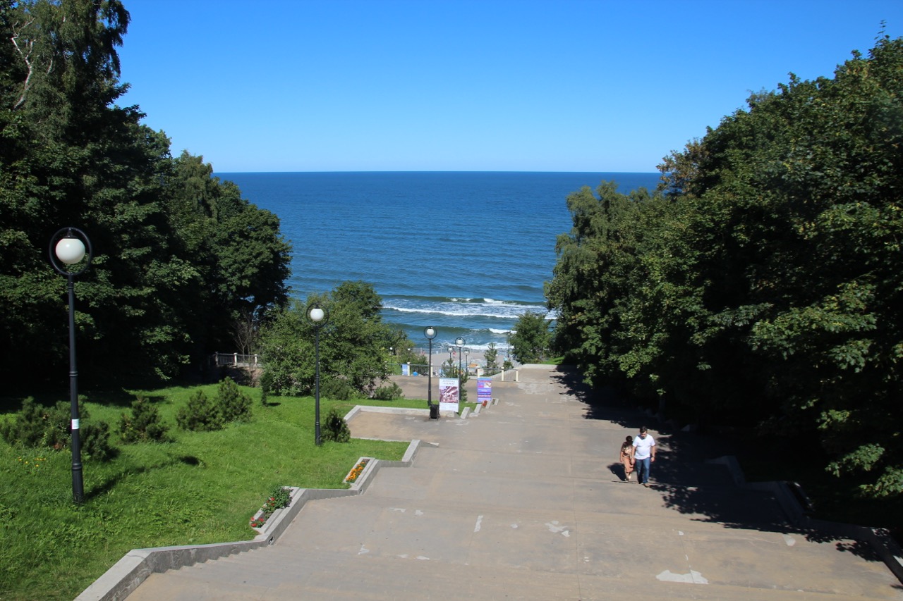 Wir fahren wieder zurück in Richtung Königsberg, und dann weiter in Richtung Nordwesten bis Rauschen. Der Badeort hat etwa 10.000 Einwohner und liegt an der samländischen Ostseeküste. Als wir dort ankommen, sehe ich das typische Flair, das wohl jeder Badeort an der Nord- und Ostseeküste hat. Viele Buden, die vor allem Bernstein in allen Variationen anbieten, sowie Badekleidung, Essen und Trinken und was das Herz der Badegäste sonst noch begehrt. Da Rauschen im 2. Weltkrieg nicht zerstört wurde, ist viel von der alten Bausubstanz erhalten und sogar bis auf wenige Ausnahmen in gutem Zustand. Man merkt, dass die Stadt heute ein beliebtes Ausflugsziel der etwas betuchteren Bevölkerung von Königsberg ist und auch aus dem ganzen Rest der Russischen Föderation im Sommer Gäste kommen. Viele der Gebäude sind noch im Besitz des Militärs, da Rauschen nach dem Krieg vor allem der Erholung und Genesung von Soldaten und Offizieren diente. Der Strand hier ist nur bedingt zum Baden geeignet, da die Küste sehr felsig ist und der früher vorhandene Sandstrand bis auf wenige Reste inzwischen von der Ostsee abgetragen wurde. Dafür gibt es eine schöne Uferpromenade auf der sich noch dutzende von weiteren Verkaufsständen aneinanderreihen.